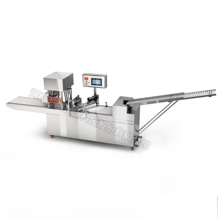 DMT90-Ⅲ觸摸屏微電腦控制方饅頭生產線是將面帶通過自動分割,整形機輸送,分割后送入主機二次壓片整形,卷成條胚,由刀切機構成形,制出成品,并使產品重量更加精確,有光澤,有筋度,保持純仿手工的工藝及口味,更加節省人力。